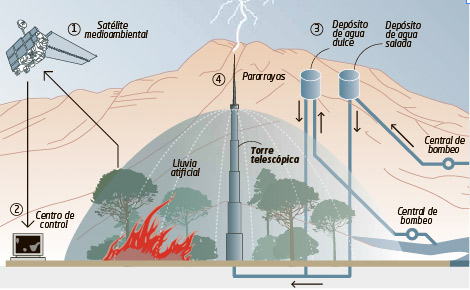 Ahora viene con un sistema para apagar incendios y generar energía por medio de depósitos de agua. Resulta, aunque no hable de ello en el artículo, que también incluye la parte de la desalación , que ahora ya no necesita de los agujeros de 600 metros de profundidad (se ve que después de 10 años ha escuchado a los críticos). Aunque el problema siga siendo el mismo (las bombas siguen siendo necesarias), al menos ya no es necesario hacer un agujero inicial, "sólo" construir un gran depósito en una montaña.